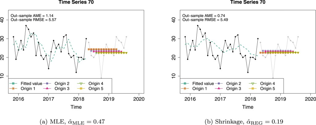 This research was inspired by my last published paper in shrinkage estimators for exponential smoothing (ETS) models. A shrinkage estimator in ETS results in a smoother line, compared to MLE, and the forecasts over origins are pretty much similar. Then, this intrigued me: well, if I were a decision maker, I would have liked this kind of forecasts! There must be some values. I reached out Nikos and we are now writing this research paper.